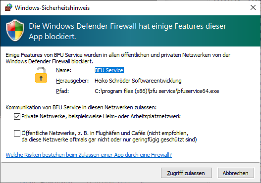 Wenn Sie unter Windows 10 den Microsoft Windows Defender zur Windows Sicherheit verwenden, wird dann am Ende der Installation ein „Windows-Sicherheitshinweis“ eingeblendet werden.